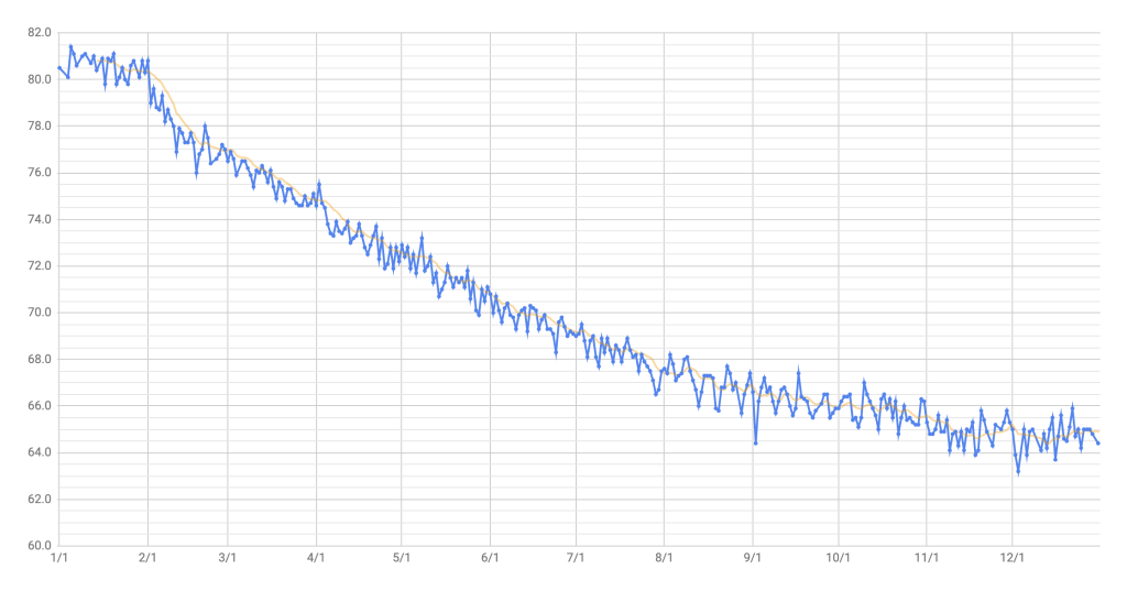 2023年の2月から12月末までの体重の推移をグラフにしたものです。
