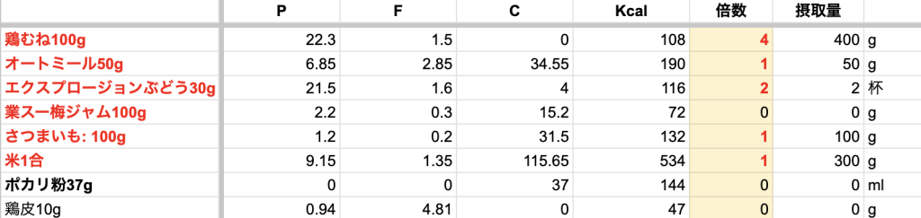 毎回カロリーやタンパク質量から食品を計算して食べる生活を続けることは私には不可能だと思いましたので、朝と昼にこの「基本セット」を食べる事をルーティン化させました。