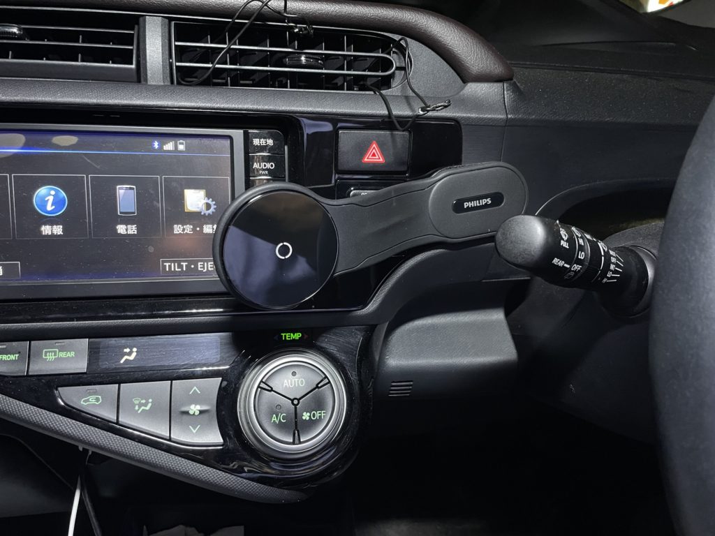 コンパクトな車なので、ダッシュボードまわりの余分なスペースが少なく、取り付け場所を見つけるのに少々苦労しました。