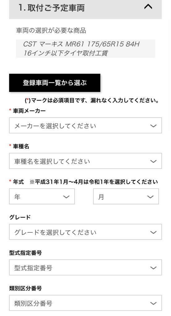 購入手続きの画面では取り付ける車の情報を入力します。