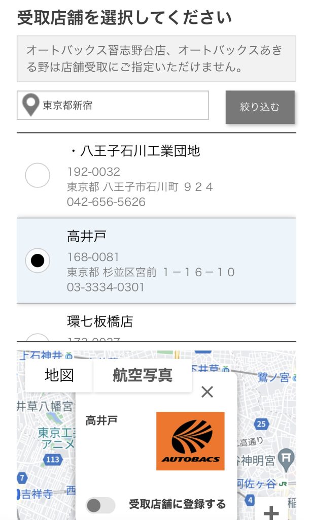続いて配送先のオートバックス店舗を選びます。