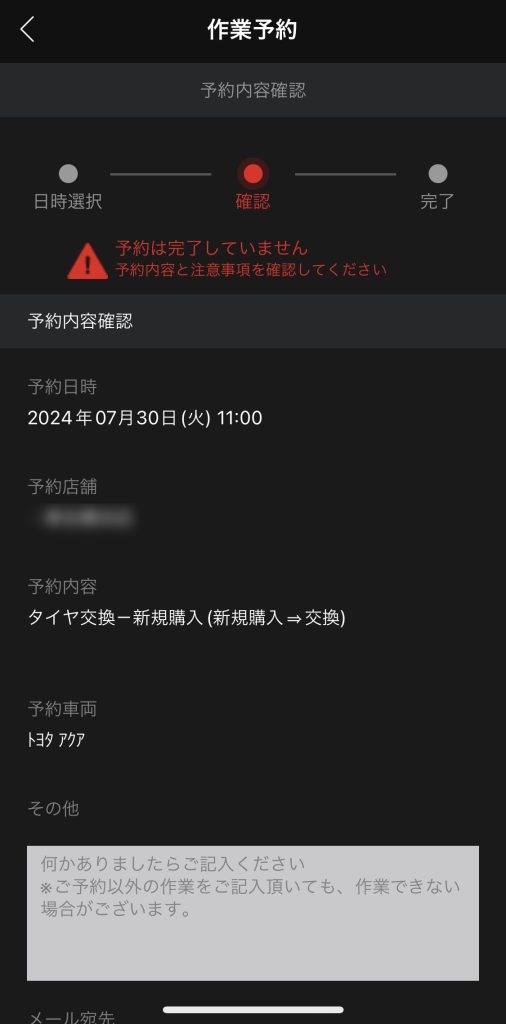 確認画面でその他の部分にオンライン購入したタイヤだという事と購入した時の注文番号を入力しておきました。