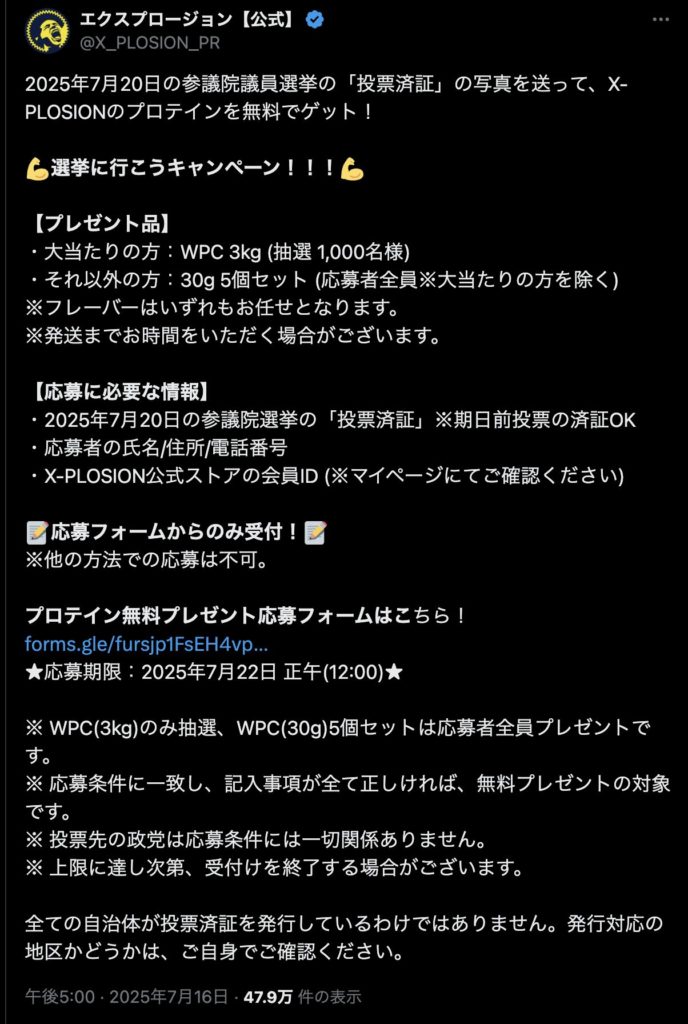これは、2025年7月20日の参議院議員選挙の「投票済証」の写真を送ると、応募者全員にエクスプロージョン【X-PLOSION】プロテインパウダーが当たるキャンペーンです。